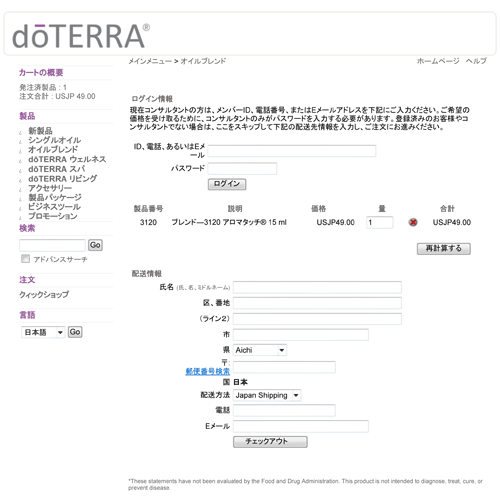 以上でご購入の手続きが完了すると、請求書(ご注文の控え)が電子メールにて送られてきます。 2週間以上たっても商品が送られてこない場合は、何らかのトラブルがあった可能性もありますので、その場合は、ドテラカスタマーセンターへご連絡下さい。 【doTERRAカスタマーセンター(日本語対応です)】 050-5806-5757 japan@doterra.com 営業時間 9:00~17:00(月)・7:00~17:00(火~金)・7:00~13:00(土) お問い合わせの際は、請求書(ご注文控え)に記載されている、注文番号をあわせてお知らせ頂けますとトラブルが早めに解決できる可能性が高まります。宜しくお願い致します。